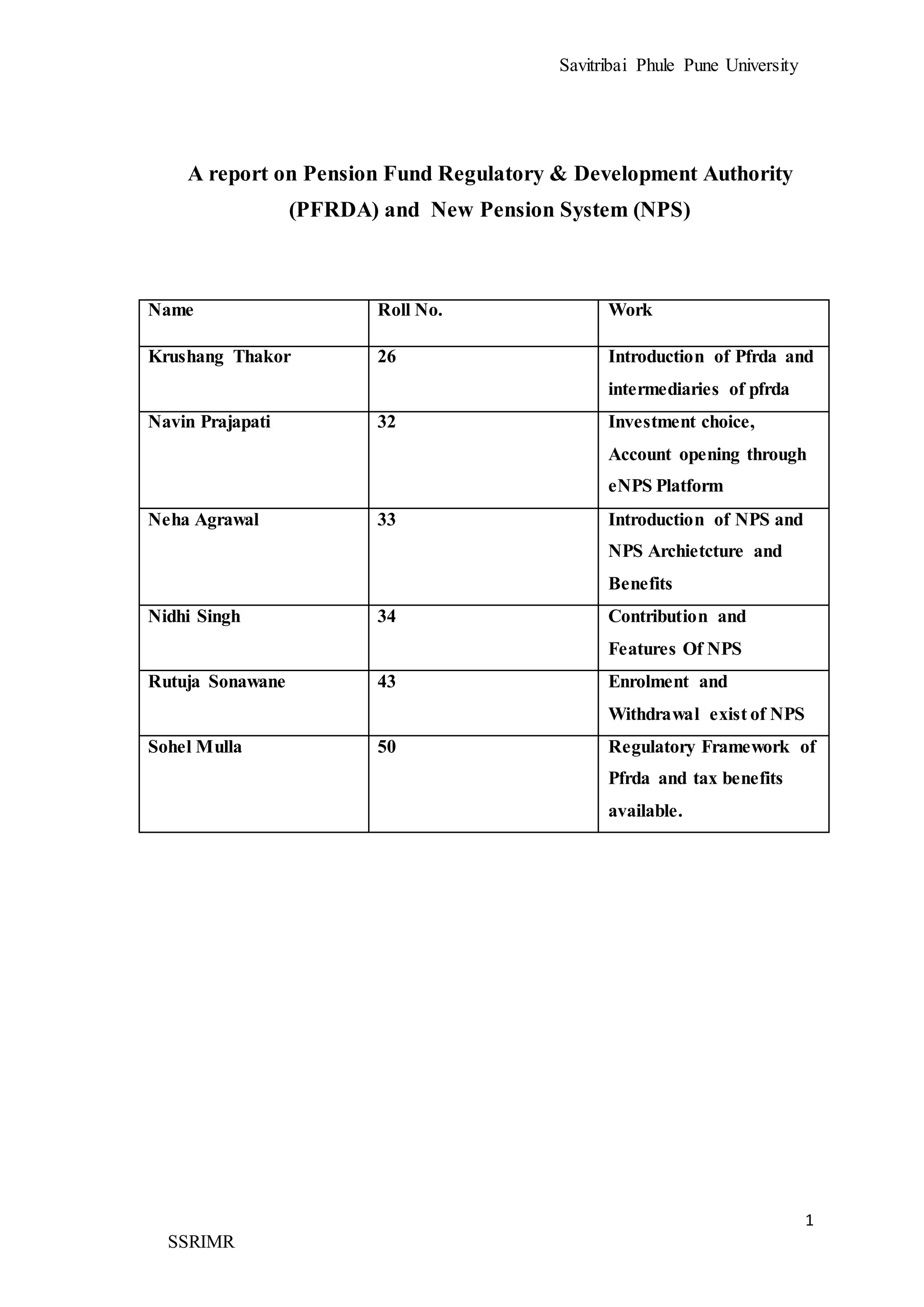 1. The document discusses the Pension Fund Regulatory and Development Authority (PFRDA) and the National Pension System (NPS) in India. It provides details about the intermediaries involved in NPS like NPS Trust, Central Recordkeeping Agency, Pension Funds, Trustee Bank, and others.