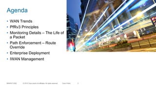 PFRv3 is Cisco's next generation performance routing technology designed for intelligent traffic management across hybrid WANs. It enables real-time monitoring and application-aware routing to optimize performance by dynamically adjusting paths based on network conditions. Key components include centralized management, policy enforcement, and support for significant scaling across multiple sites.