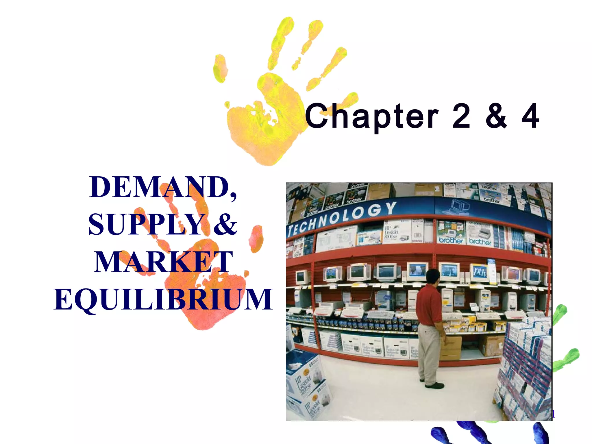 This document provides an overview of demand, supply, and market equilibrium. It begins with introducing the key concepts of demand, including the law of demand which states that as price increases, quantity demanded decreases. Supply is also introduced, with the law of supply stating that as price increases, quantity supplied also increases. Market equilibrium is explained as the price where quantity demanded equals quantity supplied. The document then discusses how equilibrium can change if either demand or supply shifts due to various factors such as income, prices of related goods, technology, and more. Examples are provided to illustrate these concepts and how equilibrium adjustments occur when demand or supply changes.