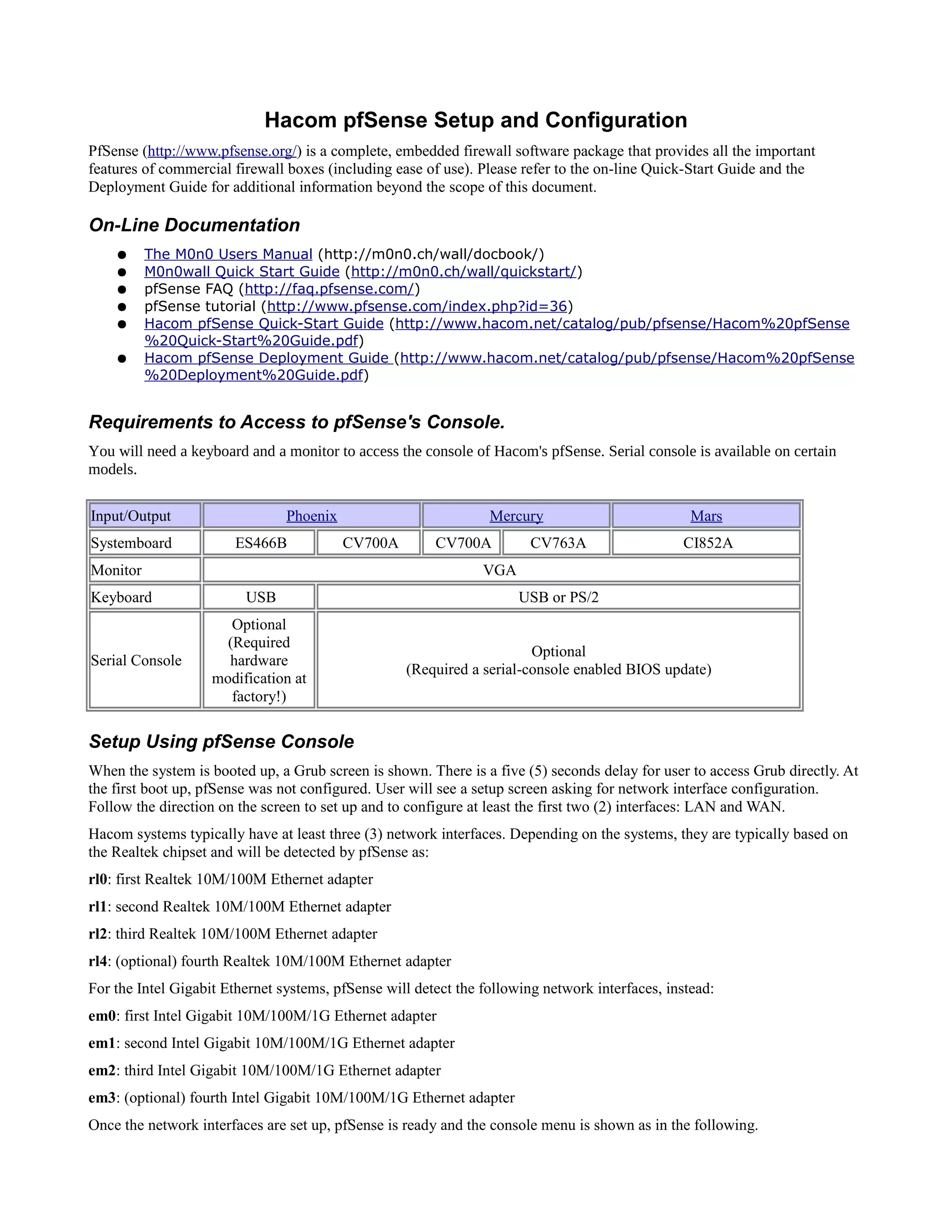 PfSense is an open source firewall software that provides features similar to commercial firewalls. It can be installed on Hacom hardware, which typically have Realtek or Intel network interfaces. To set up PfSense, connect a monitor and keyboard during initial boot up to configure the network interfaces. The web administration interface can then be accessed through the LAN IP address. Firmware updates are also described. Technical support is available from Hacom.