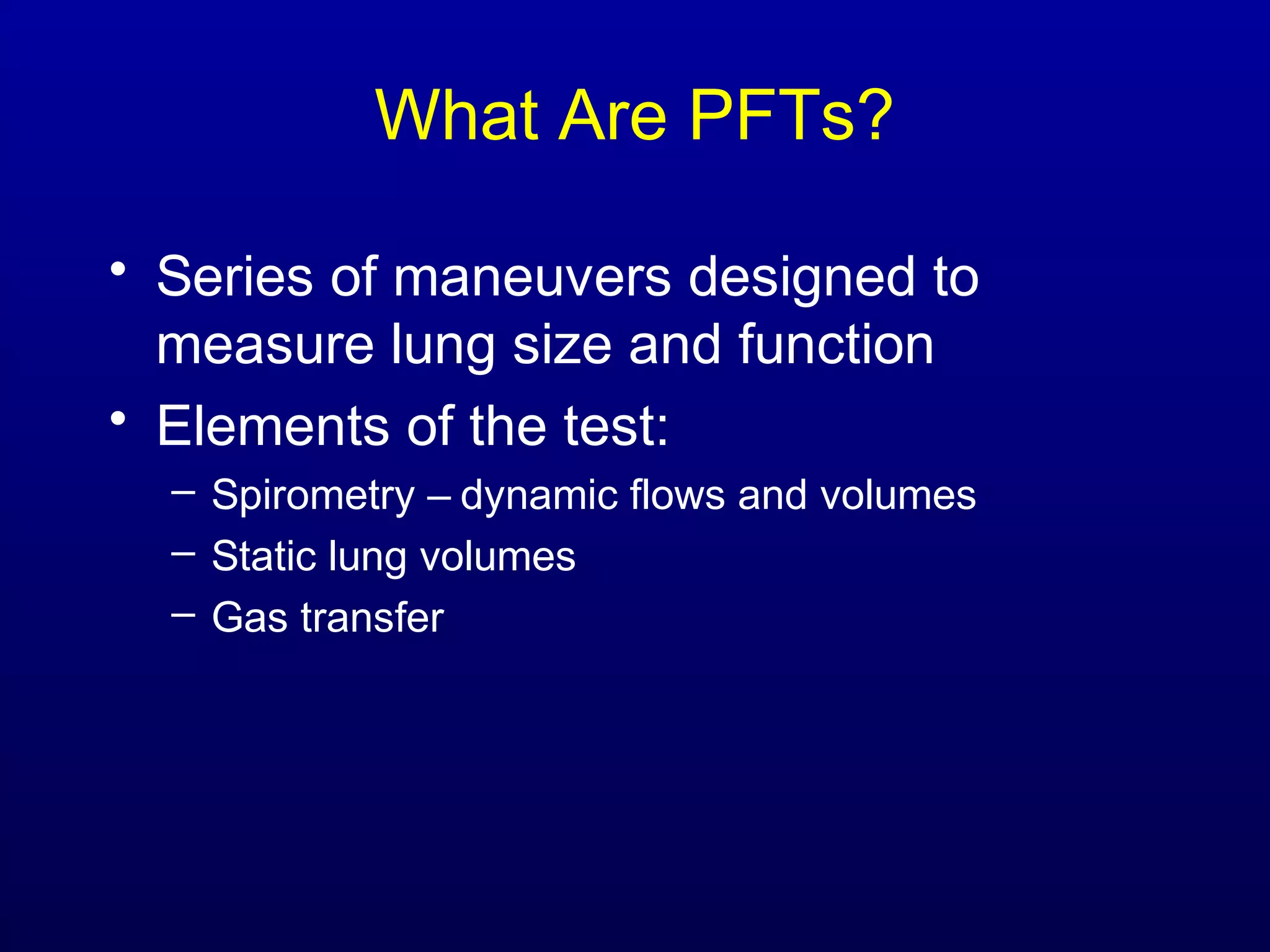 Pulmonary function tests (PFTs) measure lung size and function through spirometry, static lung volumes, and gas transfer measurements to diagnose and assess diseases like COPD, asthma, and interstitial lung disease as well as evaluate treatment response and prognosis. PFTs involve forced exhalation and inhalation maneuvers to measure flows, volumes, and the surface area available for gas exchange. Abnormal PFT results can indicate obstructive or restrictive lung diseases and the severity is classified based on percentages of predicted values.