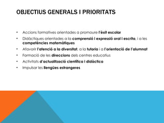 OBJECTIUS GENERALS IPRIORITATS Accions formatives orientades a promoure l’èxit escolar Didàctiques orientades a la comprensió i expressió oral i escrita , i a les competències matemàtiques Afavorir l’atenció a la diversitat , a la tutoria i a l’orientació de l’alumnat Formació de les direccions dels centres educatius Activitats d’actualització científica i didàctica Impulsar les llengües estrangeres