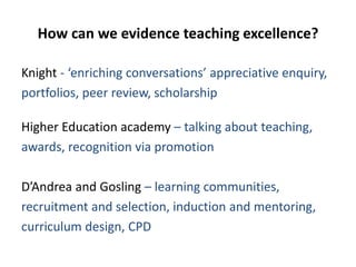 This document discusses teaching excellence from national and institutional perspectives. It provides perspectives from government ministers and organizations on the importance of teaching and evaluating teaching quality. It also discusses frameworks for evaluating teaching excellence, such as the UK Professional Standards Framework and National Student Survey. Student quotes are presented that praise excellent teachers for their teaching skills, commitment, and ability to make lessons engaging. The document considers what evidence can be used to demonstrate teaching excellence at the individual, team and institutional levels.
