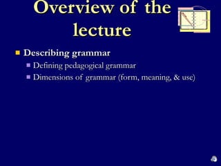 The document provides an overview of pedagogical grammar and cognitive grammar. It discusses the challenges of learning grammar, the dimensions of grammar including form, meaning and use, and assumptions of cognitive grammar such as grammar reflecting human experiences and generalizations about the world. Key cognitive processes like categorization, metaphor and metonymy are described as shaping grammar.