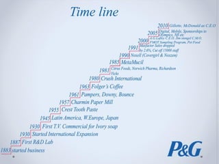 This document summarizes information about Procter & Gamble (P&G), a multinational consumer goods company. It outlines P&G's mission to provide superior quality products that improve lives, lists its CEO and headquarters, and describes its portfolio of over two dozen $1 billion brands. The document also provides financial highlights, showing P&G's annual net sales ranging from $64.4 billion to $78.9 billion from 2006 to 2010. Additionally, it summarizes P&G's marketing strategies, research methods, and SWOT analysis.