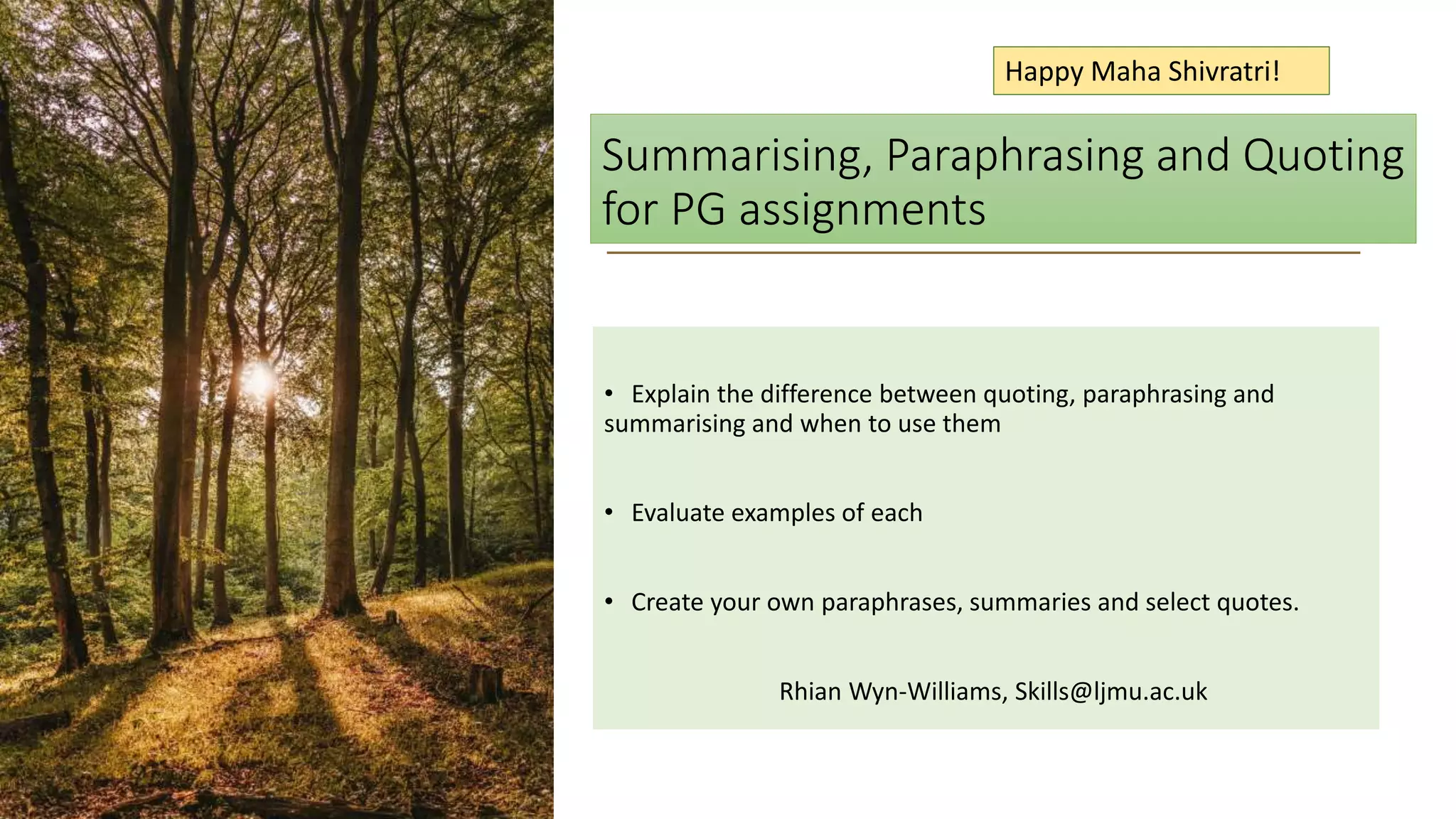 This document provides guidance on summarizing, paraphrasing, and quoting sources for academic assignments. It explains that summarizing involves concisely representing the key points of a text in your own words, paraphrasing means expressing the ideas of the author in your own words, and quoting directly copies word-for-word from the source. The document advises reading actively, taking notes, avoiding copying text directly, and properly attributing sources. Examples of summaries, paraphrases and quotes are provided and evaluated.