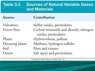 3) The atmosphere contains variable components like pollutants, aerosols from both natural and human-made sources, and water vapor that influence climate and air quality.