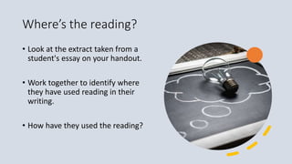 This document discusses using academic reading in postgraduate assignments. It explains that students should use reading to support arguments and ideas in their writing as they are part of an academic community that values research. Reading needs to be analyzed, compared and synthesized before being incorporated into assignments. The document provides tips for effective reading such as reading with learning objectives in mind, choosing sources carefully, and keeping notes on critical questions. It also discusses developing an academic voice by analyzing readings and stating one's own interpretations. Comparing, contrasting and synthesizing multiple sources is important for situating one's work within the existing literature. Examples are provided to demonstrate effective synthesis in writing.