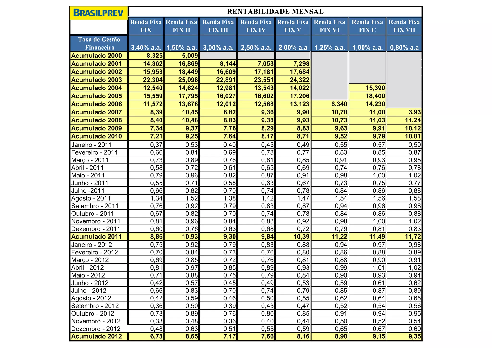 Renda Fixa Renda Fixa Renda Fixa Renda Fixa Renda Fixa Renda Fixa Renda Fixa Renda Fixa FIX FIX II FIX III FIX IV FIX V FIX VI FIX C FIX VII Taxa de Gestão Financeira 3,40% a.a. 1,50% a.a. 3,00% a.a. 2,50% a.a. 2,00% a.a 1,25% a.a. 1,00% a.a. 0,80% a.a Acumulado 2000 8,325 5,009 Acumulado 2001 14,362 16,869 8,144 7,053 7,298 Acumulado 2002 15,953 18,449 16,609 17,181 17,684 Acumulado 2003 22,304 25,098 22,891 23,551 24,322 Acumulado 2004 12,540 14,624 12,981 13,543 14,022 15,390 Acumulado 2005 15,559 17,795 16,027 16,602 17,206 18,400 Acumulado 2006 11,572 13,678 12,012 12,568 13,123 6,340 14,230 Acumulado 2007 8,39 10,45 8,82 9,36 9,90 10,70 11,00 3,93 Acumulado 2008 8,40 10,48 8,83 9,38 9,93 10,73 11,03 11,24 Acumulado 2009 7,34 9,37 7,76 8,29 8,83 9,63 9,91 10,12 Acumulado 2010 7,21 9,25 7,64 8,17 8,71 9,52 9,79 10,01 Janeiro - 2011 0,37 0,53 0,40 0,45 0,49 0,55 0,57 0,59 Fevereiro - 2011 0,66 0,81 0,69 0,73 0,77 0,83 0,85 0,87 Março - 2011 0,73 0,89 0,76 0,81 0,85 0,91 0,93 0,95 Abril - 2011 0,58 0,72 0,61 0,65 0,69 0,74 0,76 0,78 Maio - 2011 0,79 0,96 0,82 0,87 0,91 0,98 1,00 1,02 Junho - 2011 0,55 0,71 0,58 0,63 0,67 0,73 0,75 0,77 Julho -2011 0,66 0,82 0,70 0,74 0,78 0,84 0,86 0,88 Agosto - 2011 1,34 1,52 1,38 1,42 1,47 1,54 1,56 1,58 Setembro - 2011 0,76 0,92 0,79 0,83 0,87 0,94 0,96 0,98 Outubro - 2011 0,67 0,82 0,70 0,74 0,78 0,84 0,86 0,88 Novembro - 2011 0,81 0,96 0,84 0,88 0,92 0,98 1,00 1,02 Dezembro - 2011 0,60 0,76 0,63 0,68 0,72 0,79 0,81 0,83 Acumulado 2011 8,86 10,93 9,30 9,84 10,39 11,22 11,49 11,72 Janeiro - 2012 0,75 0,92 0,79 0,83 0,88 0,94 0,97 0,98 Fevereiro - 2012 0,70 0,84 0,73 0,76 0,80 0,86 0,88 0,89 Março - 2012 0,69 0,85 0,72 0,76 0,81 0,88 0,90 0,91 Abril - 2012 0,81 0,97 0,85 0,89 0,93 0,99 1,01 1,02 Maio - 2012 0,71 0,88 0,75 0,79 0,84 0,90 0,93 0,94 Junho - 2012 0,42 0,57 0,45 0,49 0,53 0,59 0,61 0,62 Julho - 2012 0,66 0,83 0,70 0,74 0,79 0,85 0,87 0,89 Agosto - 2012 0,42 0,59 0,46 0,50 0,55 0,62 0,64 0,66 Setembro - 2012 0,36 0,50 0,39 0,43 0,47 0,52 0,54 0,56 Outubro - 2012 0,73 0,89 0,76 0,80 0,85 0,91 0,94 0,95 Novembro - 2012 0,33 0,48 0,36 0,40 0,44 0,50 0,52 0,54 Dezembro - 2012 0,48 0,63 0,51 0,55 0,59 0,65 0,67 0,69 Acumulado 2012 6,78 8,65 7,17 7,66 8,16 8,90 9,15 9,35