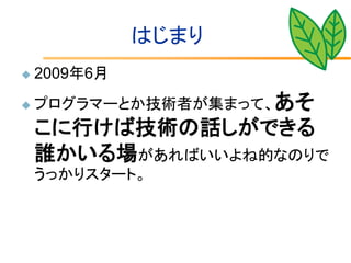 2009年6月 プログラマーとか技術者が集まって、あそ こに行けば技術の話しができる 誰かいる場があればいいよね的なのりで うっかりスタート。