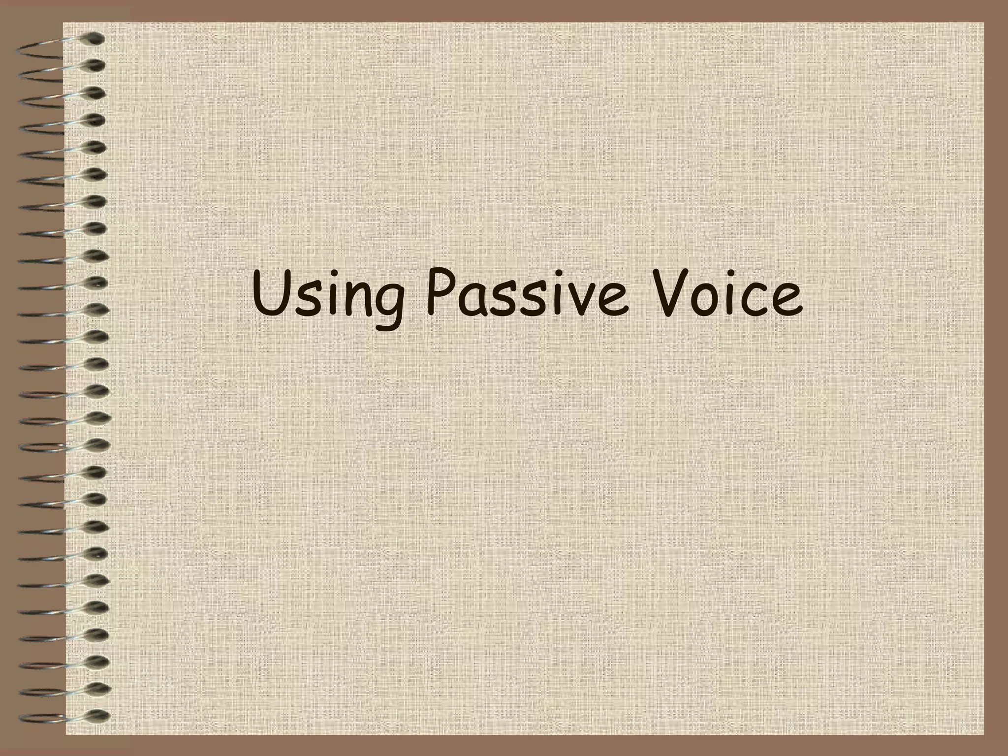 The document discusses the passive voice and how to form passive sentences correctly. It explains that the direct object of an active sentence becomes the subject of the passive sentence. Only verbs that have a direct object can be made passive. The tense of the passive sentence is some form of "be" plus the past participle. Examples are given of active and passive voice. The document also discusses when to use the passive voice and common problems to avoid, such as using the passive when active voice is better or forming the passive incorrectly.