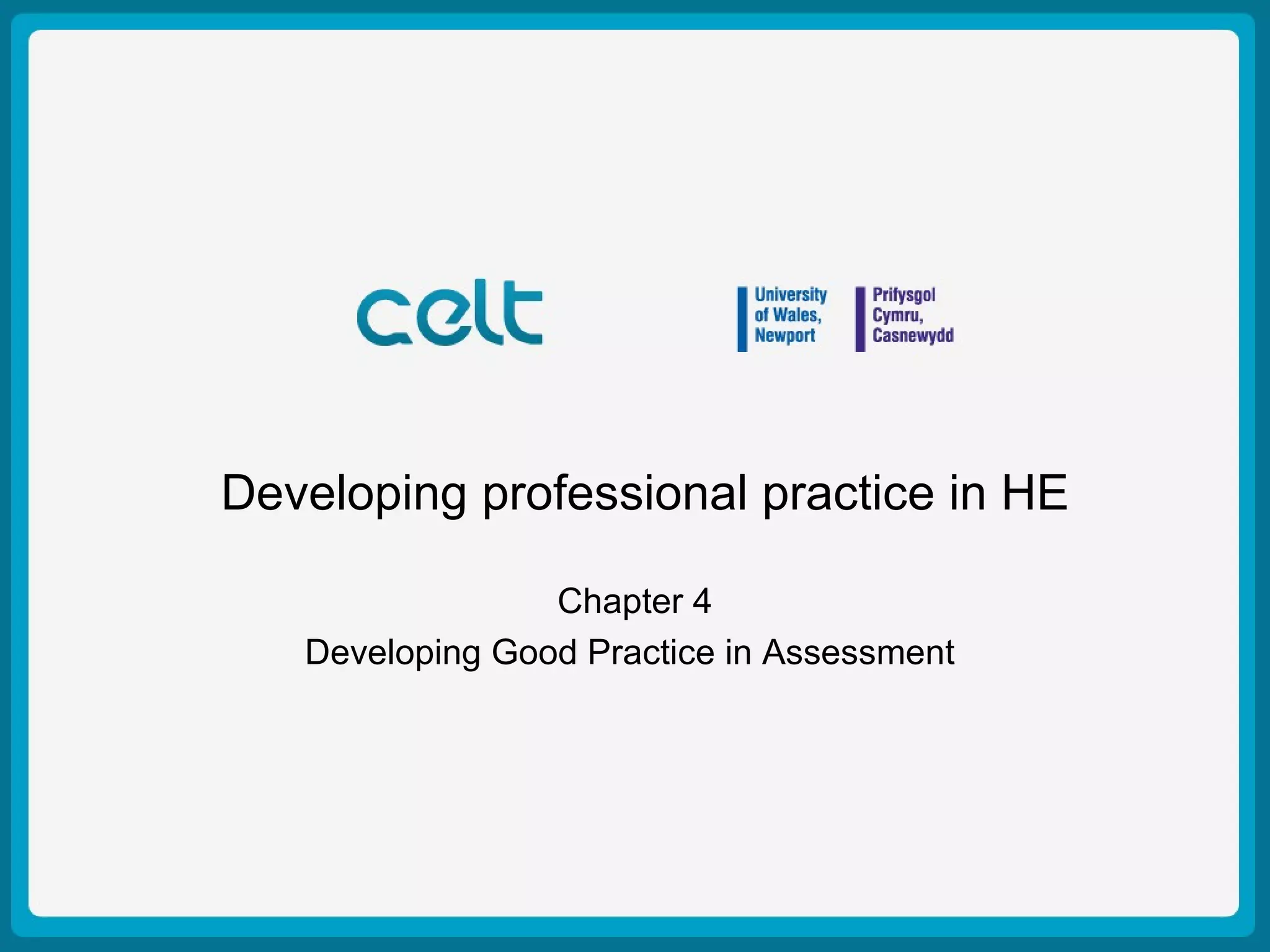 This chapter discusses developing good practice in assessment in higher education. It identifies the multiple stakeholders in assessment, including students, departments, and employers. It explores the different purposes of assessment, such as diagnosing learning, informing teaching, ranking students, and accreditation. The chapter then examines the assessment process and different modes of assessment, including norm-referenced, criterion-referenced, and ipsative assessment. Key issues in ensuring assessment is valid, reliable and transparent are discussed. The chapter concludes by considering how to develop assessment for learning using tools such as reflective journals, online discussions, and group projects.