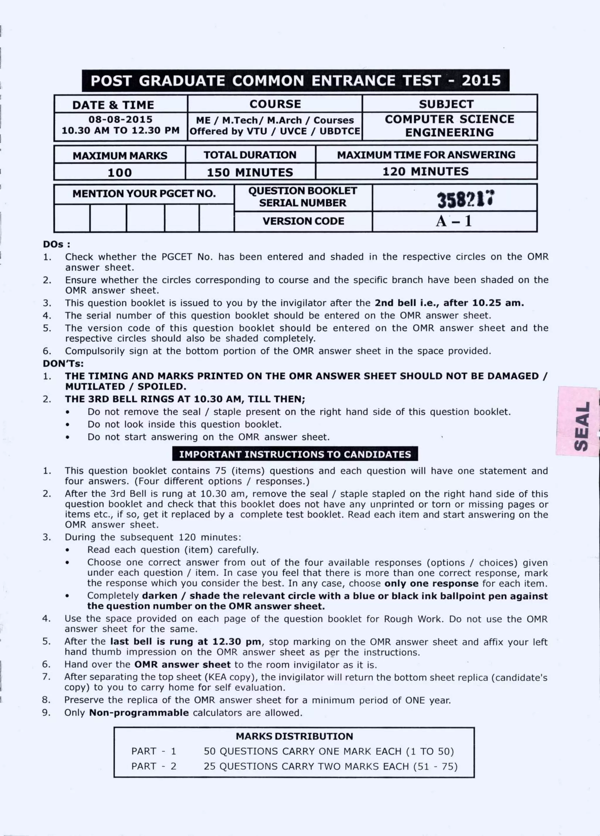 The document is a notification for the Post Graduate Common Entrance Test (PGCET) that will be administered on August 8, 2015 for various post-graduate engineering programs. It provides important instructions for candidates regarding the exam, including the duration of the exam, maximum marks, and guidelines on properly filling out the answer sheet. It also lists the subject that will be covered, which is Computer Science Engineering, and provides a breakdown of the number and type of questions that will be on the exam.