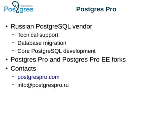 The document discusses PostgreSQL in-core compression features, particularly focusing on storage optimization techniques and the use of Compressed File System (CFS) in PostgreSQL Pro Edition. It covers best practices for schema design, data types, and the impact of various compression algorithms on performance and database size. Additionally, it outlines the advantages and disadvantages of CFS, as well as a roadmap for future improvements to PostgreSQL's storage capabilities.