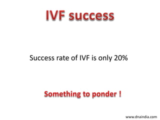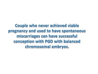 Chromosomal abnormalities are a major cause of IVF failure, with only a 20% success rate. During embryo development, errors can occur that lead to an abnormal number or structure of chromosomes. Traditional embryo selection methods often miss these issues. Preimplantation genetic diagnosis (PGD) tests embryos for chromosomal abnormalities like aneuploidy before transfer using techniques like FISH or microarray analysis. This allows identification and transfer of only healthy embryos, improving IVF outcomes and preventing genetic disorders.