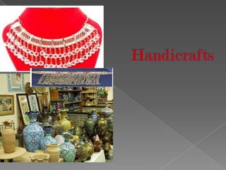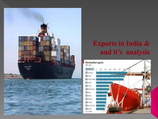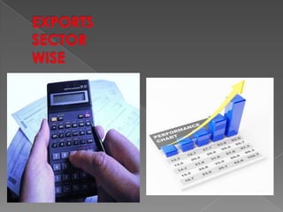 The document discusses India's economy and trade, breaking down sectors into primary, secondary and tertiary industries. It provides statistics on India's exports of various goods from 1996-2010, showing growth in sectors like textiles, gems and jewelry, leather, and engineering. Key export markets for Indian goods are also identified as Europe, the US, UAE, and other Asian countries.