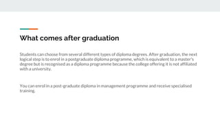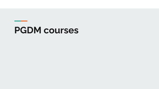 Students can enroll in a Post Graduate Diploma in Management (PGDM) program after completing their bachelor's degree. PGDM programs provide specialized training equivalent to a master's degree and are offered by colleges not affiliated with universities. There are several specializations available for PGDM programs, including business management, marketing, operations management, information technology, finance, retail management, supply chain management, and human resource management. These postgraduate diploma courses are taught using both textual and practical methods to give students a thorough understanding of the subject matter. Students can find information about PGDM programs and specializations offered by the Institute of Technology and Management on its website.