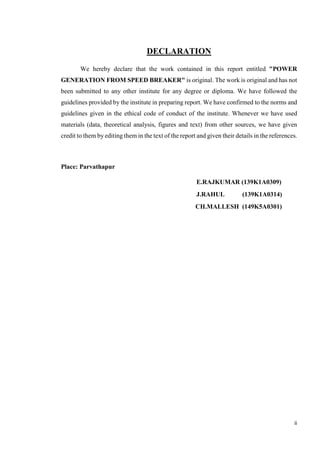 The document is a certificate for a project report submitted by three students - E.Rajkumar, J.Rahul, and Ch.Mallesh - for their Bachelor of Technology degree in Mechanical Engineering from Jawaharlal Nehru Technological University. It certifies that the project report titled "POWER GENERATION FROM SPEED BREAKER" documents bonafide work carried out by the students under the guidance of their internal guide Mr. V.Rajashekar and external examiner Mr. G.Kartheek Kumar, and was approved by the principal Dr. M.Sujatha.