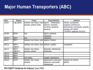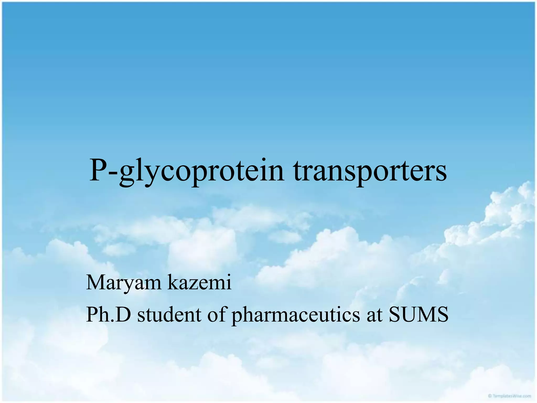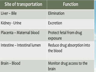 P-glycoprotein transporters are ATP-binding cassette transporters that pump substances out of cells and limit the prolonged effectiveness of chemotherapy drugs. P-glycoprotein is encoded by the MDR1 gene, contains 12 transmembrane domains and two ATP binding sites. It is expressed in the intestine, kidney, liver, placenta, and blood-brain barrier, protecting against toxins. Many chemotherapy drugs, antibiotics, and cardiovascular drugs are substrates. P-glycoprotein uses ATP hydrolysis to actively transport substrates unidirectionally out of cells. First generation inhibitors were substrates themselves and toxic. Second generation inhibitors had low affinity. Third generation inhibitors have high specificity and potency. Caco-2 cells are used