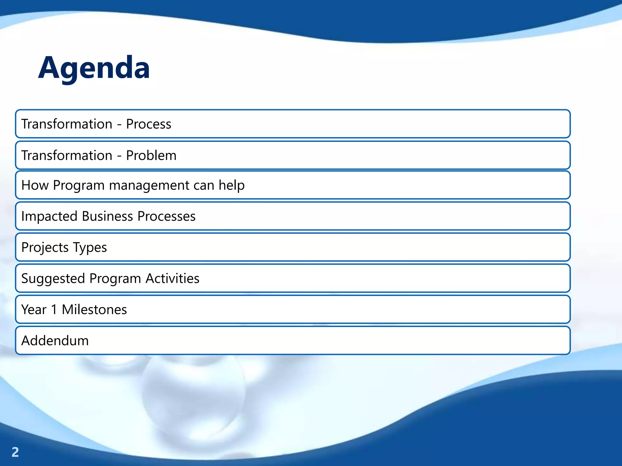 The document outlines a program management framework for business transformations, emphasizing the need for structured process transformation and cultural change to achieve strategic goals and improve business efficiencies. It details the various types of projects and activities necessary for successful transformation over the first year, including cloud computing strategies and infrastructure development. Additionally, the document distinguishes between project and program management, highlighting the broader scope and strategic oversight required for programs.