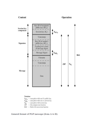 PGP (Pretty Good Privacy) is a software program that provides data encryption and decryption to secure emails and files. It uses public key infrastructure (PKI) and encryption algorithms like RSA and Diffie-Hellman to encrypt data. PGP allows users to have multiple public/private key pairs to encrypt and digitally sign messages and files. It generates random session keys to encrypt data symmetrically and includes the encrypted session key with the encrypted message. This allows the recipient to decrypt the session key and then the message content. PGP is widely used due to its availability across platforms, use of secure algorithms, and applicability for both personal and business use.