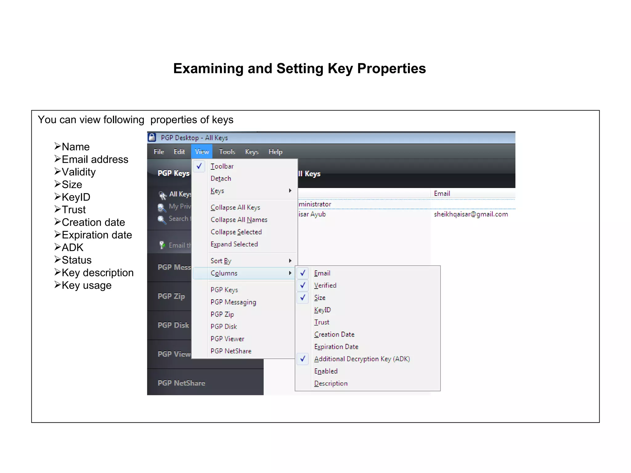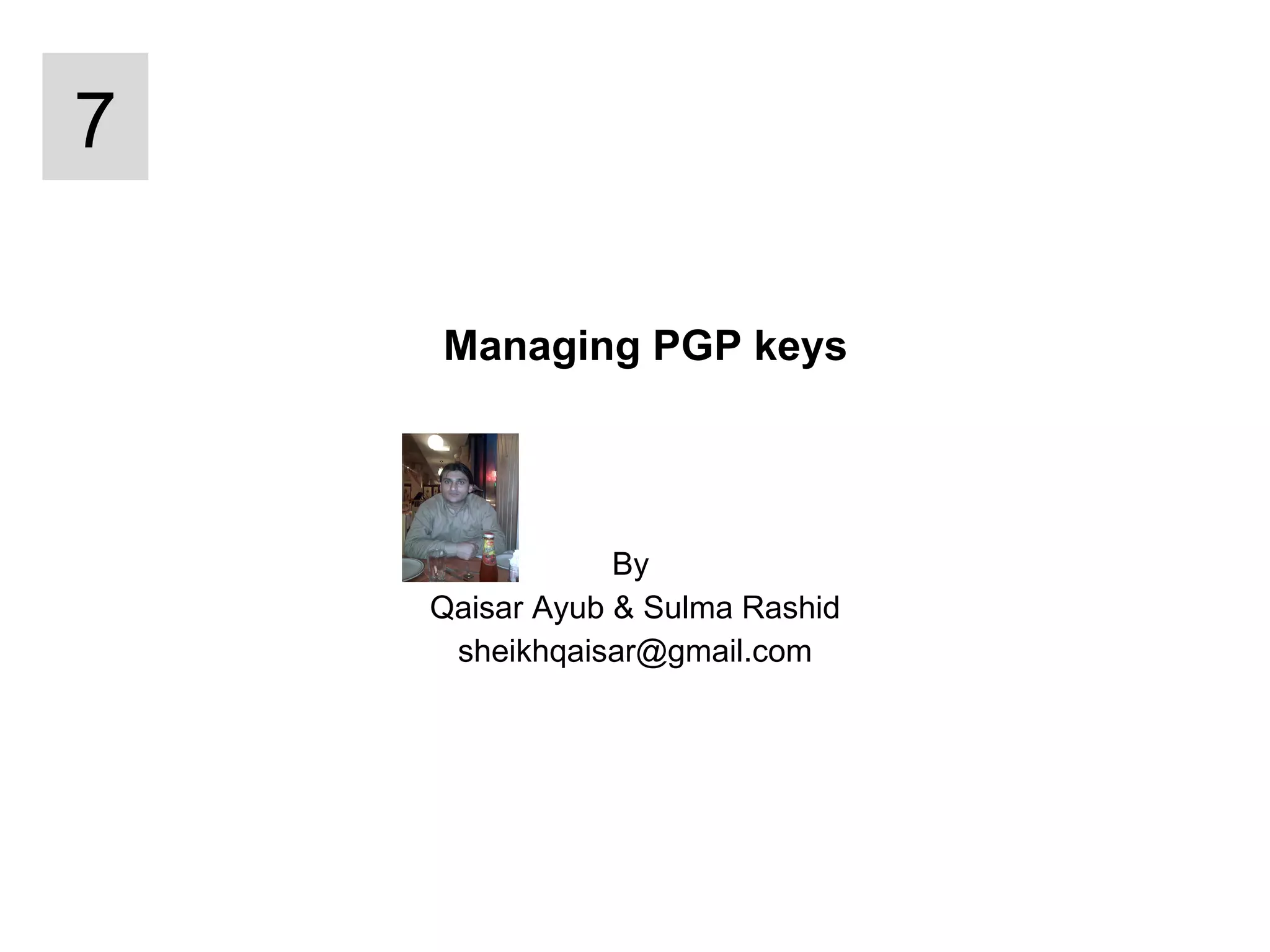 The document discusses various topics related to managing PGP keys and securing email messages with PGP Desktop. It describes how to view and set key properties, import and delete keys, change passphrases, verify keys, sign keys, and work with subkeys. It also explains how PGP Desktop can encrypt, sign, decrypt, and verify emails to provide secure email messaging when configured with an email client. The policies that PGP Desktop uses for incoming and outgoing messages are also summarized.