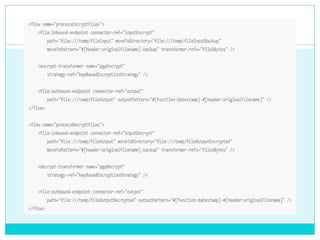 This document discusses how to configure Pretty Good Privacy (PGP) security on Mule connectors. PGP provides encryption and authentication for data communication. Key elements needed for PGP include a security manager, key manager, and credential accessor. The security manager holds encryption strategy and key rings. The key manager reads the key rings and requires configuration of public/secret rings, alias ID, and passphrase. The credential accessor determines the key ID to use for encryption/decryption based on message contents. Examples show configuring these elements and using encrypt/decrypt transformers.