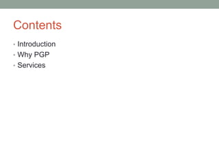 2. PGP offers five main services - digital signatures for authentication, symmetric encryption for confidentiality, compression, encoding for email compatibility, and message segmentation.