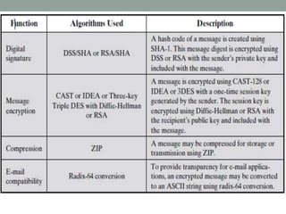 3. The document describes how PGP provides both authentication and encryption of messages using a combination of public key and symmetric key cryptography. Digital signatures verify the identity of the sender and encrypted symmetric keys protect the confidentiality of messages.