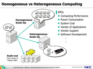 This document discusses GPU accelerated computing and programming with GPUs. It provides characteristics of GPUs from Nvidia, AMD, and Intel including number of cores, memory size and bandwidth, and power consumption. It also outlines the 7 steps for programming with GPUs which include building and loading a GPU kernel, allocating device memory, transferring data between host and device memory, setting kernel arguments, enqueueing kernel execution, transferring results back, and synchronizing the command queue. The goal is to achieve super parallel execution with GPUs.