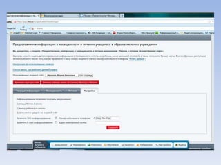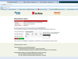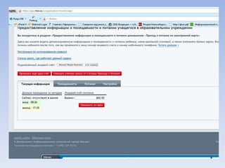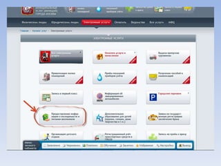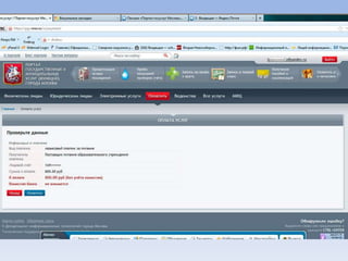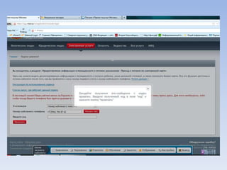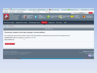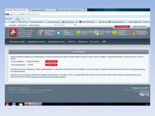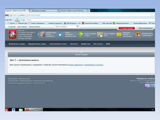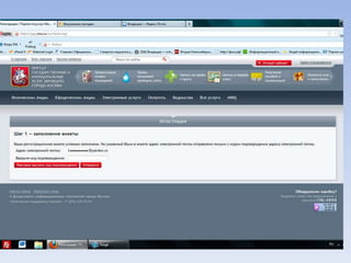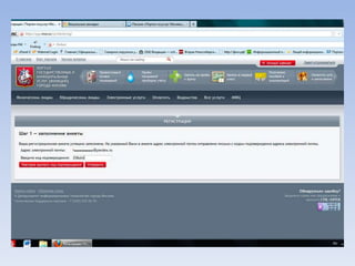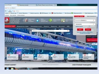 Документ описывает портал государственных и муниципальных услуг города Москвы и процедуры регистрации на нём. Через портал можно получать информацию о балансе лицевого счета на оплату школьного питания, записывать детей в лагерь и на приём к врачу, а также оплачивать коммунальные услуги. Портал предлагает множество дополнительных услуг для пользователей.