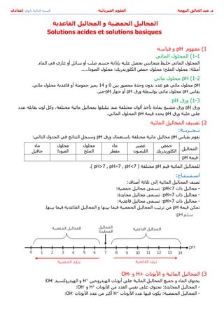 يتناول المستند موضوع المحاليل الحمضية والقاعدية، بما في ذلك قياس pH وتصنيفات المحاليل بناءً على قيمتها. كما يوضح الأخطار المرتبطة باستخدام هذه المواد الكيميائية والاحتياطات الواجب اتخاذها لضمان السلامة. يُستنتج أن عملية التخفيف تؤثر على خصائص المحاليل وتساعد في تقليل خطورتها.