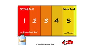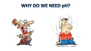 The document provides information about pH and the pH scale. It defines pH as a measure of the concentration of hydrogen ions (H+) in a solution, with lower pH numbers indicating more H+ ions and higher numbers indicating fewer H+ ions. Examples are given of the pH of common household substances like lemon juice, milk, orange juice and others to help understand where different substances fall on the pH scale.