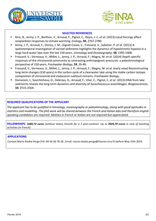 This document outlines a PhD proposal on assessing how local human pressures influence lakes' vulnerability and responses to climate change across Europe. The proposal involves meta-analyzing paleoecological data from 15 lakes around the Alps to compare responses of pelagic biological communities to climate change and determine if variability depends on local human pressures. The student will analyze diatom and cladoceran remains and photosynthetic pigments in sediments to compare community responses over time between lakes and quantify the influence of geomorphology and local human impacts. The supervisors are from INRA CARRTEL in France and CNR ISE in Italy.