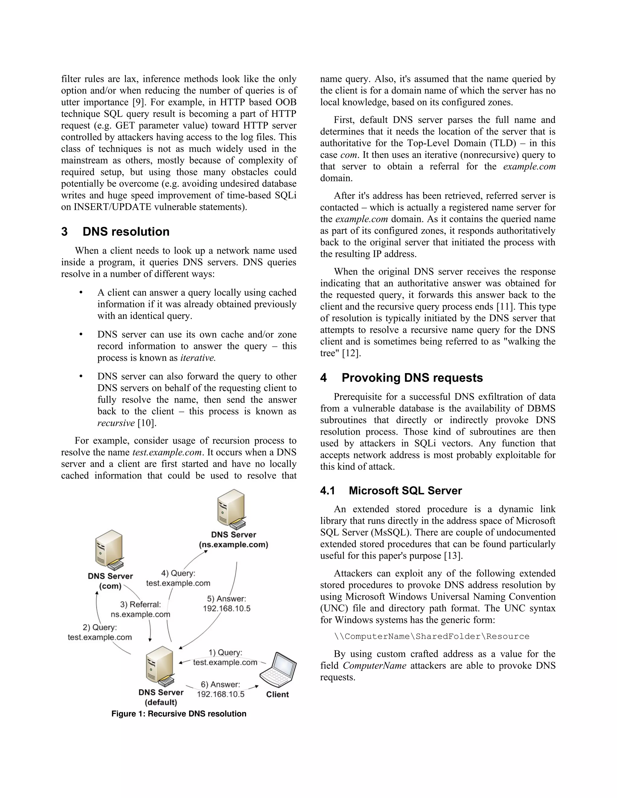This document discusses advanced SQL injection techniques utilizing DNS resolution to exfiltrate data from vulnerable databases. It details how attackers can manipulate DNS requests to retrieve sensitive information such as passwords by leveraging specific database management system (DBMS) functionalities. The paper also explores various SQL injection methods, tools like sqlmap, and their capabilities in automating data retrieval through DNS exfiltration.