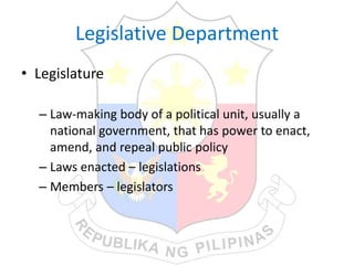 The document summarizes the legislative department in the Philippines. It discusses that the legislature is the law-making body, which in the Philippines is the Congress consisting of the Senate and House of Representatives. It provides details on the composition, elections, terms and qualifications of Senators and Congressmen. It also outlines the legislative process of how a bill becomes a law, including the roles of both houses of Congress and the President. Finally, it mentions some non-legislative powers of Congress like impeachment and approval of appointments.