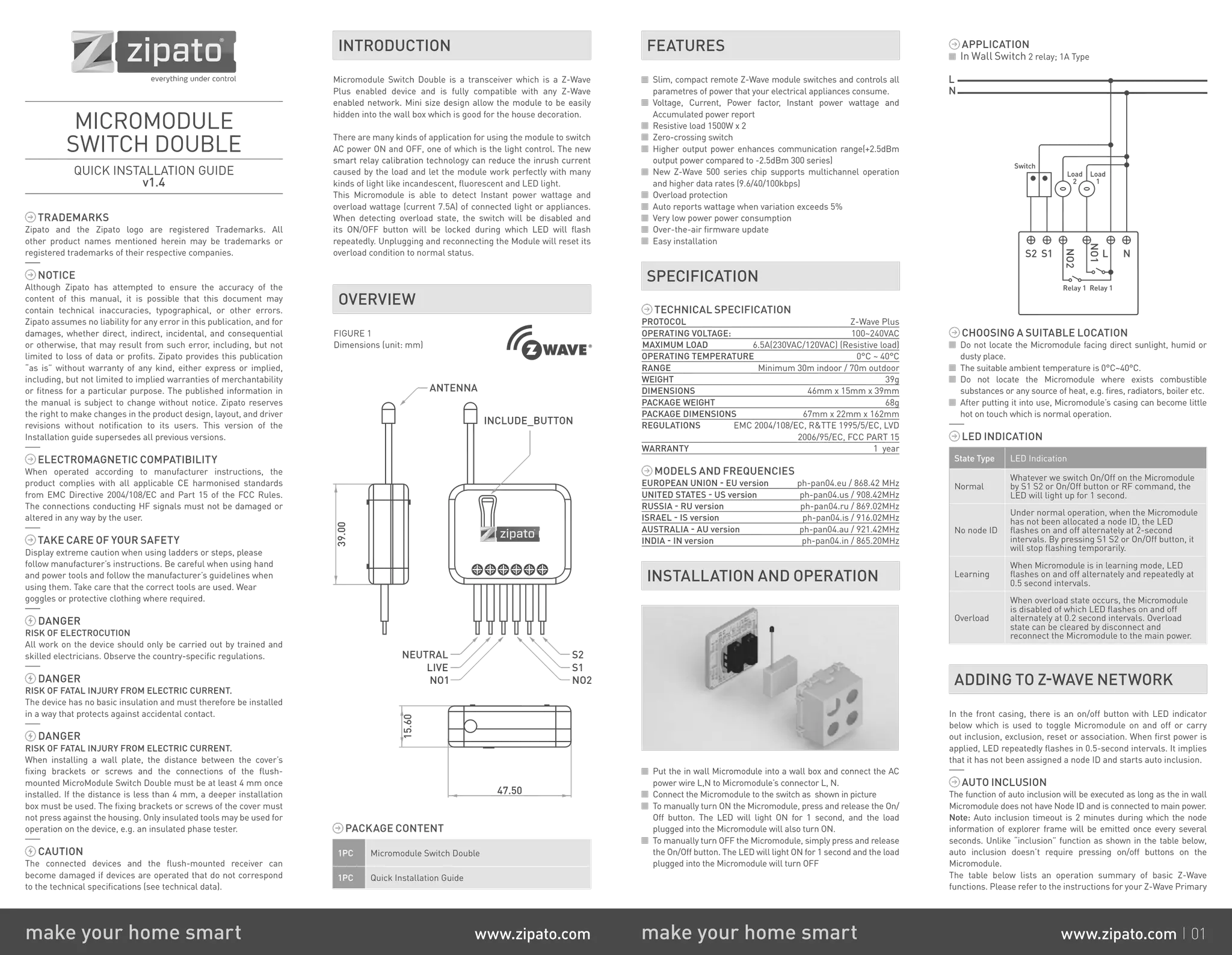 This document provides information about Zipato trademarks, product names, notices, electromagnetic compatibility, safety precautions, features, specifications, and installation of Zipato products. It notes that Zipato and the Zipato logo are registered trademarks, discusses limitations of liability and warranty coverage, and provides installation instructions and specifications for Zipato devices. Safety warnings are provided for working with electricity and using power tools for installation.