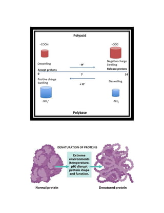pH-sensitive polymers are polymers that change their physical properties in response to changes in pH. They include polyelectrolytes that have ionizable groups that become charged or uncharged depending on the pH. The properties that change include chain conformation, configuration, and solubility. This makes pH-sensitive polymers useful for applications like targeted drug delivery where a drug core can be released when the polymer reaches a certain pH. Examples of uses include insulin delivery systems and tumor treatment by targeting medicine specifically to tumor sites. Living polymerization is often used to control the molecular weight of these polymers.