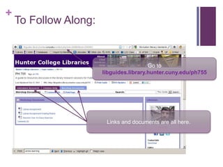 This document provides an overview of concepts and skills for information retrieval and literature research. It discusses the importance of information literacy and introduces databases like MEDLINE, PubMed, EBSCO and Ovid that can be used to search for medical literature. It explains how Medical Subject Headings (MeSH) are used to index articles in MEDLINE and highlights features of the Ovid interface like selecting MeSH terms and exporting bibliographies. Finally, it demonstrates how Boolean logic can be applied to construct search queries using keywords related to a topic or research question.