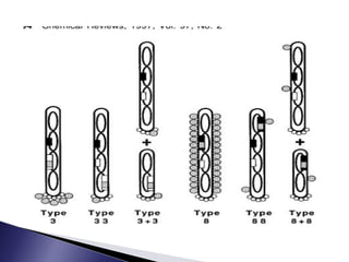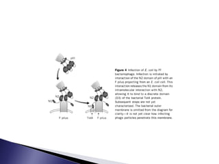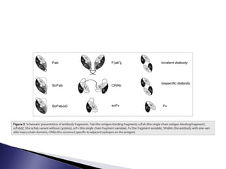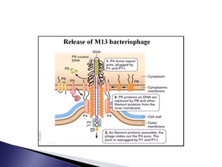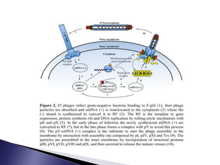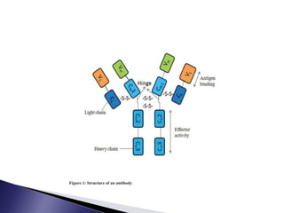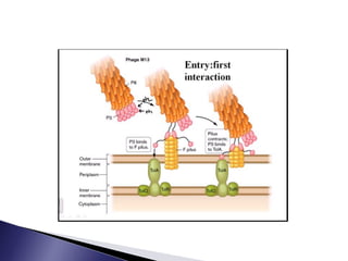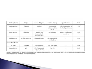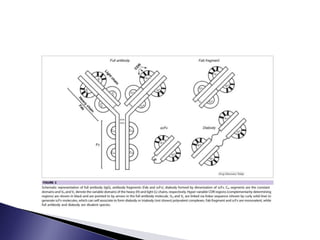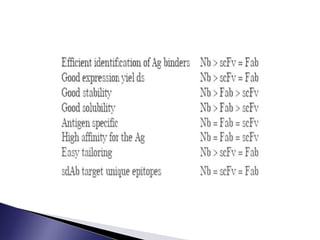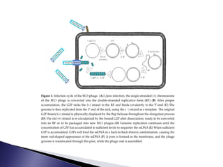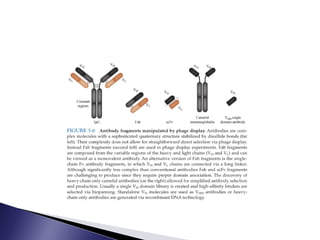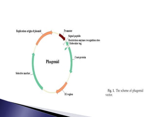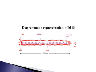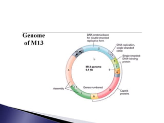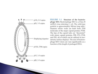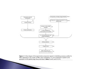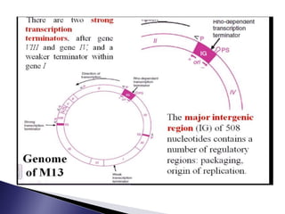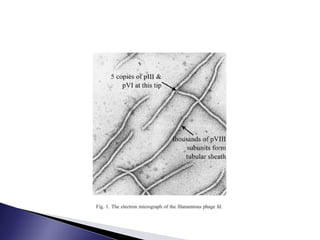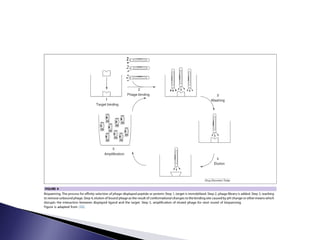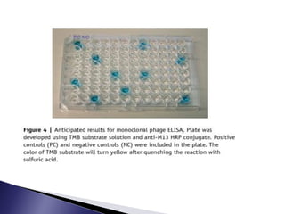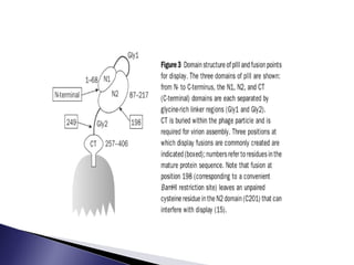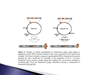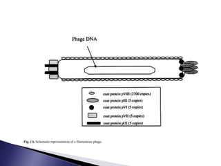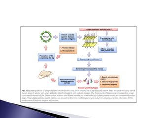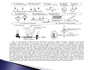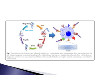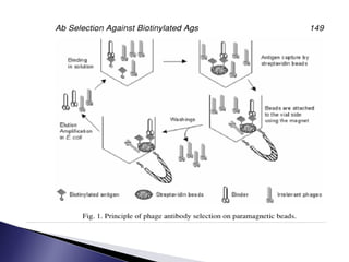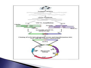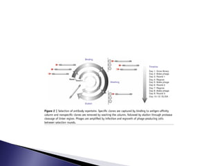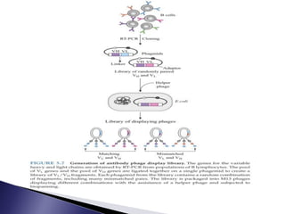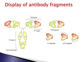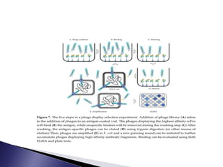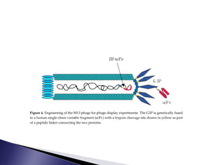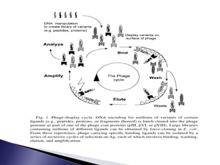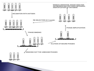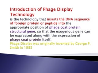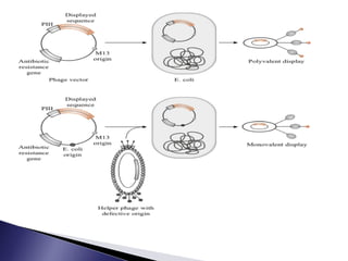 The document discusses phage display technology. It introduces phage display and describes the biology of filamentous phages like M13 that are commonly used. It explains how phagemids combine features of plasmids and phages to allow expression of recombinant proteins. Different types of phage display systems are described, including types that display antibody fragments. The process of biopanning and screening phage display libraries to isolate antibodies with high affinity for a target is summarized in three steps: production of the library, selection through biopanning, and screening candidates. Applications of phage display technology including production of monoclonal antibodies are also mentioned.
