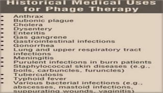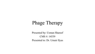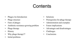 This document provides an overview of phage therapy. It discusses bacteriophages and their structure. It covers the growing problem of antibiotic resistance and how phage therapy could provide an alternative treatment. The history of phage therapy is reviewed, along with initial problems, solutions, administration examples, and future implications. Both advantages and disadvantages of phage therapy are presented. The document concludes that modern innovations in phage therapy combined with careful scientific methodology may help enhance its effectiveness as an alternative to antibiotics for drug-resistant bacterial infections.