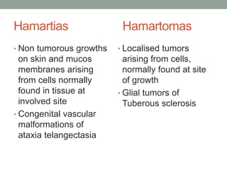This document discusses various phakomatoses, which are defined as neurocutaneous syndromes with autosomal dominant inheritance and multi-organ hamartomas or tumors. It describes several specific phakomatoses including neurofibromatosis types 1 and 2, tuberous sclerosis, Sturge-Weber syndrome, Von Hippel-Lindau disease, and Wyburn-Mason syndrome. For each, it covers epidemiology, pathogenesis, characteristic ocular and systemic findings, diagnostic criteria, investigations, and treatment.
