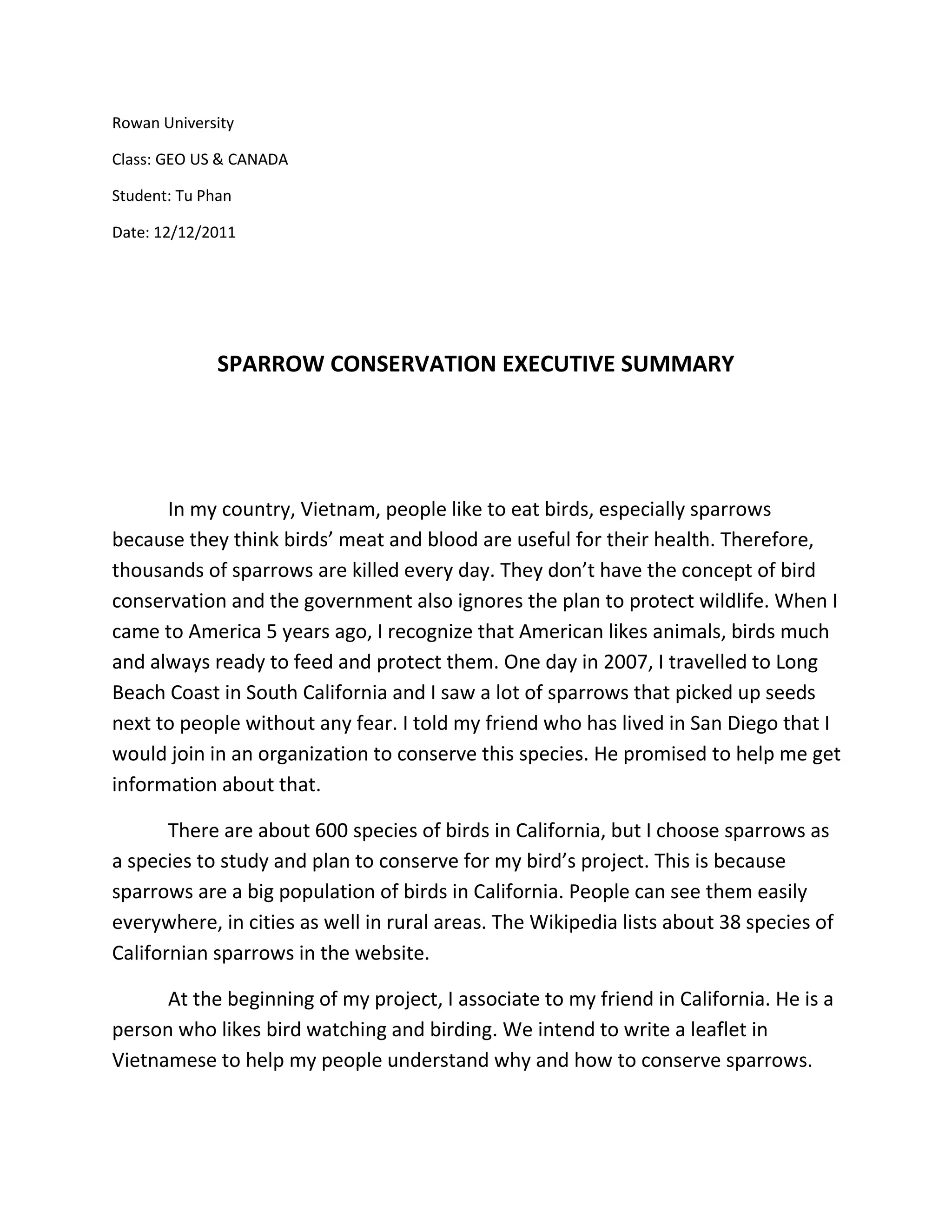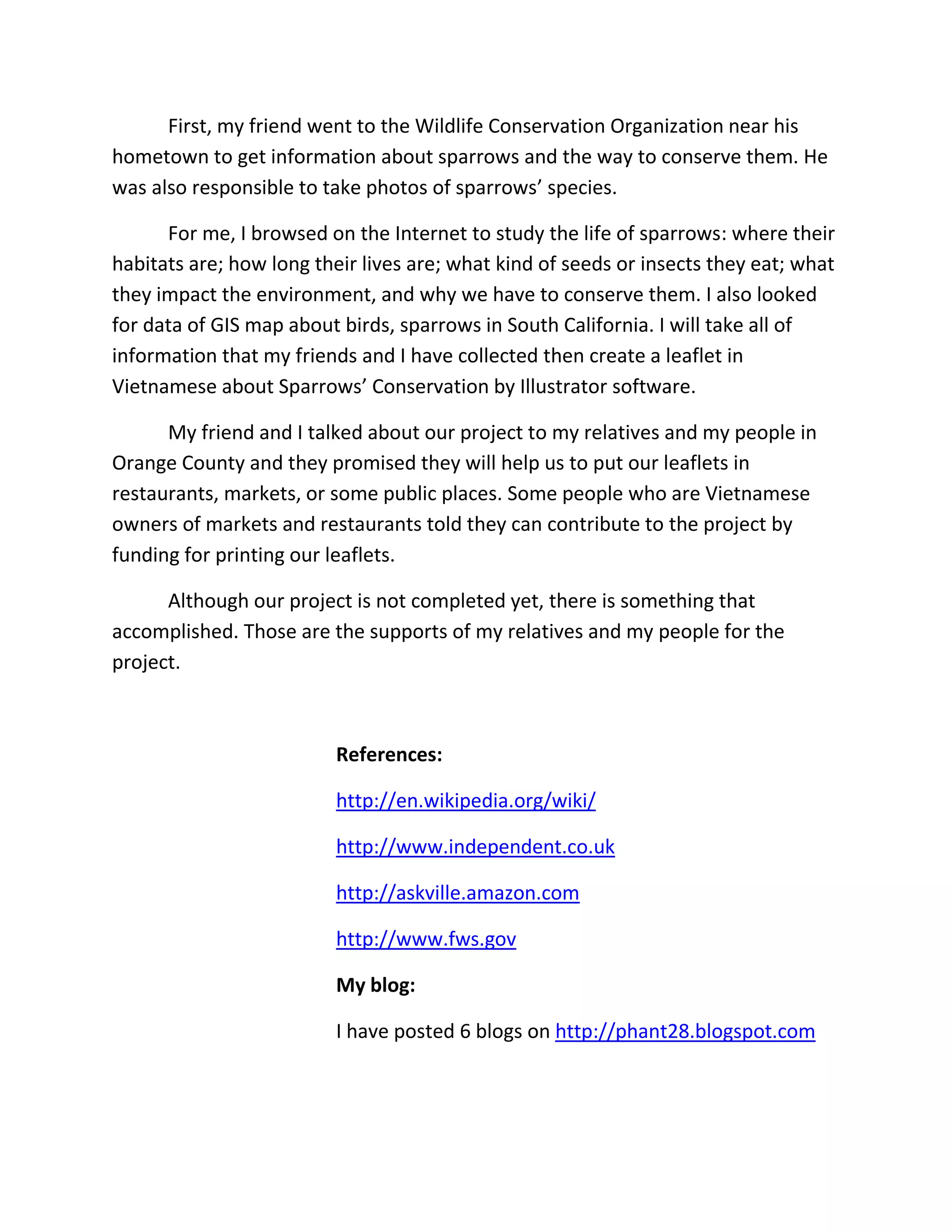 The student is working on a project to conserve sparrows in California. They are creating an informational leaflet in Vietnamese about sparrows and conservation efforts. The student's friend is helping by providing information and photos from a wildlife organization. They are researching sparrows' habitats, life cycles, diets and environmental impacts. The student plans to illustrate the leaflet and distribute it in Vietnamese restaurants and markets, with support from the community. The goal is to educate their community in Vietnam about the importance of sparrow conservation.