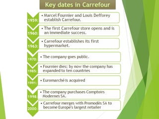 Carrefour is an international hypermarket chain headquartered in France. It operates over 15,600 stores globally making it the second largest retailer in the world. Carrefour emerged in 1958 and has since expanded internationally, deriving over 57% of its revenue outside of France. It aims to satisfy customer needs through various store formats including hypermarkets, supermarkets, convenience stores and cash & carry locations. Carrefour sees growth opportunities in expanding further into large markets like China, Brazil, India and Turkey.