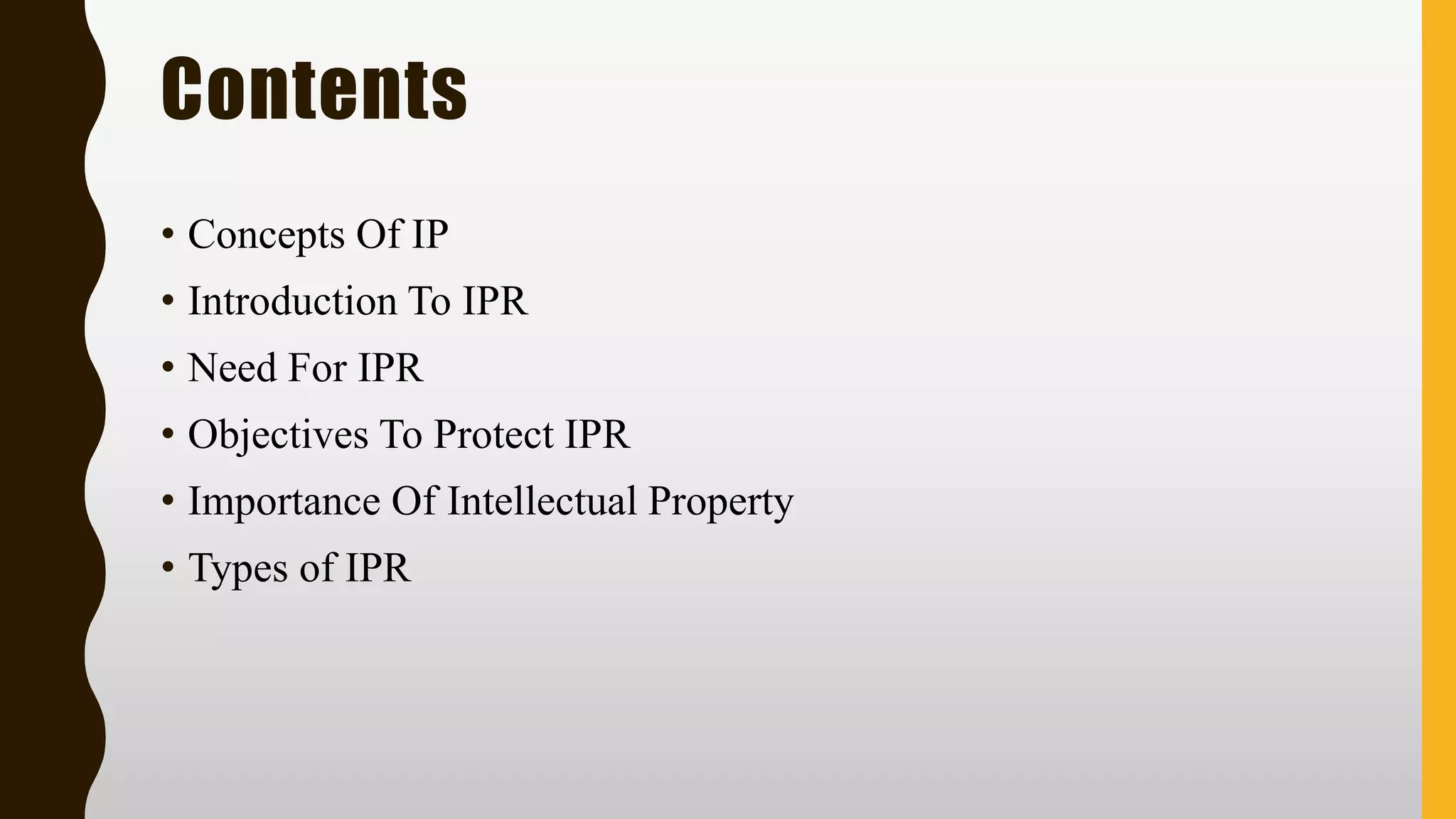This document provides an overview of general principles of intellectual property. It defines intellectual property as creations of the mind in industrial, scientific, literary and artistic fields. Intellectual property is divided into industrial property and copyright. Industrial property includes patents, trademarks, industrial designs, and geographical indications. Copyright covers literary, artistic, musical and dramatic works. The document discusses the need for intellectual property protection, its importance, types of intellectual property rights including patents, trademarks, designs, geographical indications, copyright, and plant varieties. It provides examples and definitions of these different types of intellectual property.