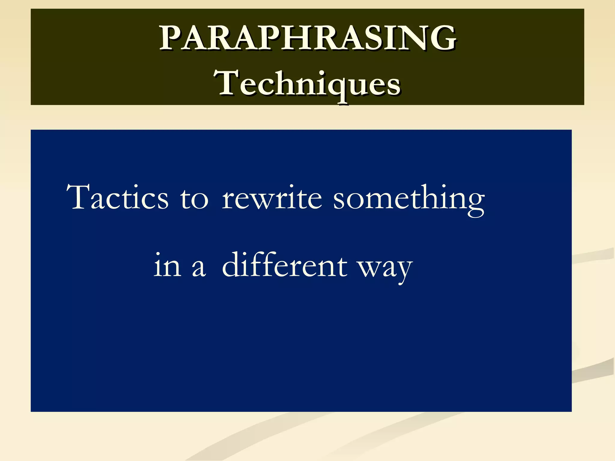 The document discusses techniques for paraphrasing text, including changing clauses to phrases, quoted to indirect speech, active to passive voice, synonyms, and word forms. It provides examples of each technique and recommends combining multiple techniques for effective paraphrasing.