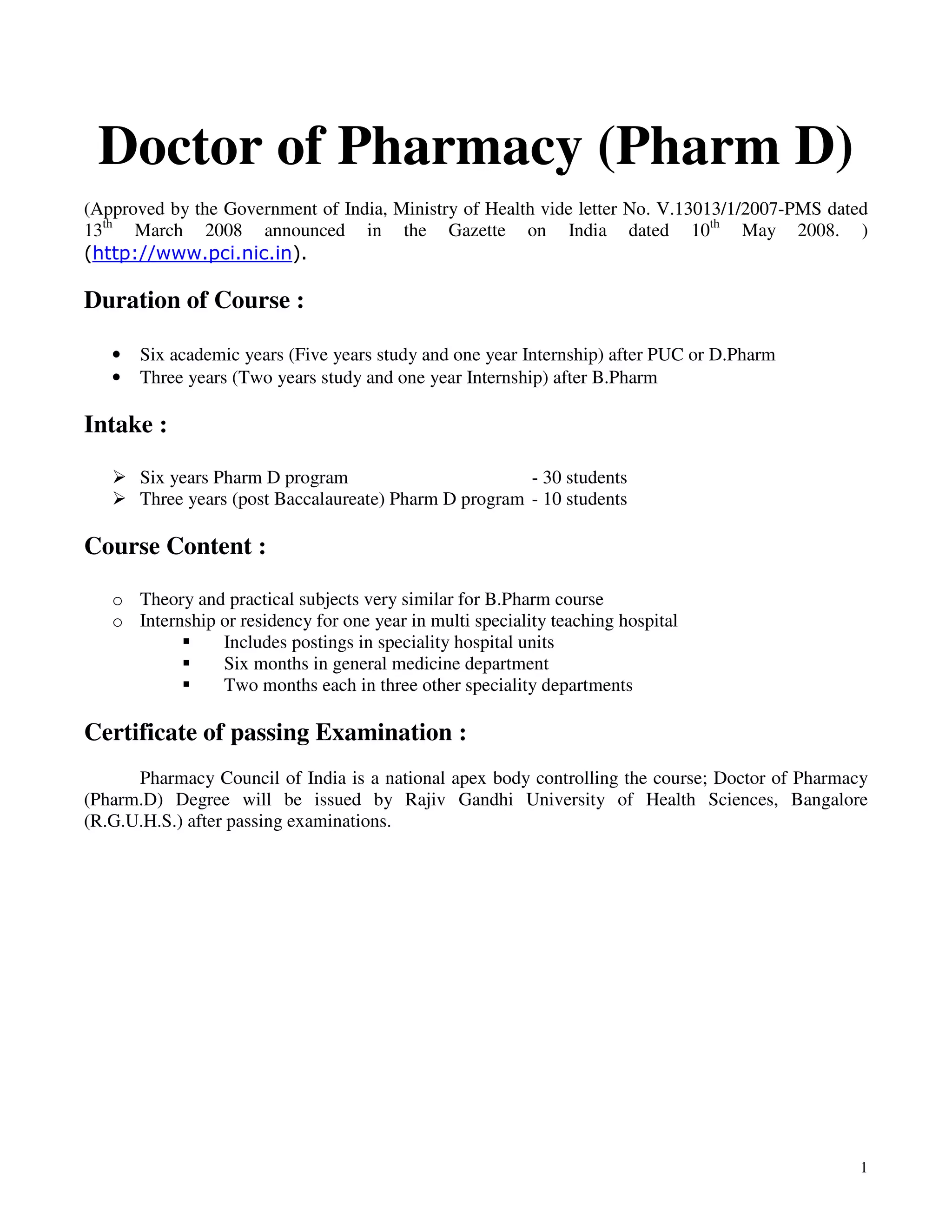 The document outlines the Doctor of Pharmacy (Pharm D) program in India. It discusses the duration, intake, course content, examinations, and eligibility for both the standard 6-year Pharm D program and the 3-year post-baccalaureate Pharm D program. The 6-year program involves 5 years of study and 1 year of internship, while the post-baccalaureate program is for students who have already completed a BPharm degree and involves 2 years of study and 1 year of internship. The course covers subjects like human anatomy, pharmacology, pharmacotherapeutics, and hospital postings. Students are examined and a Pharm D degree is awarded by the Rajiv Gand