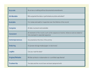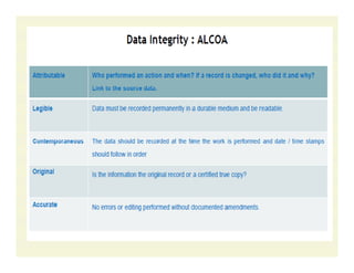 The document discusses data integrity and recent regulatory approaches. It defines data integrity as the completeness, consistency, and accuracy of data throughout its lifecycle. Regulatory agencies are increasingly focused on data integrity due to its importance in ensuring product quality and safety. Common data integrity issues found by agencies include fabricated, falsified, or missing records. Ensuring data integrity requires effective quality management systems, risk management, technology solutions, and governance.