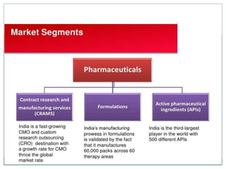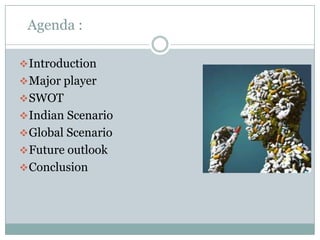 The document discusses the Indian pharmaceutical industry. It provides an overview of major players, the Indian and global scenarios, future outlook, and areas for boosting competitiveness. The industry has grown significantly over time and India is now a top producer and exporter of generic drugs globally. The outlook remains positive with the market expected to reach $74 billion by 2020 and become one of the top ten markets worldwide. However, further investment in R&D and addressing regulatory issues can help strengthen the industry.