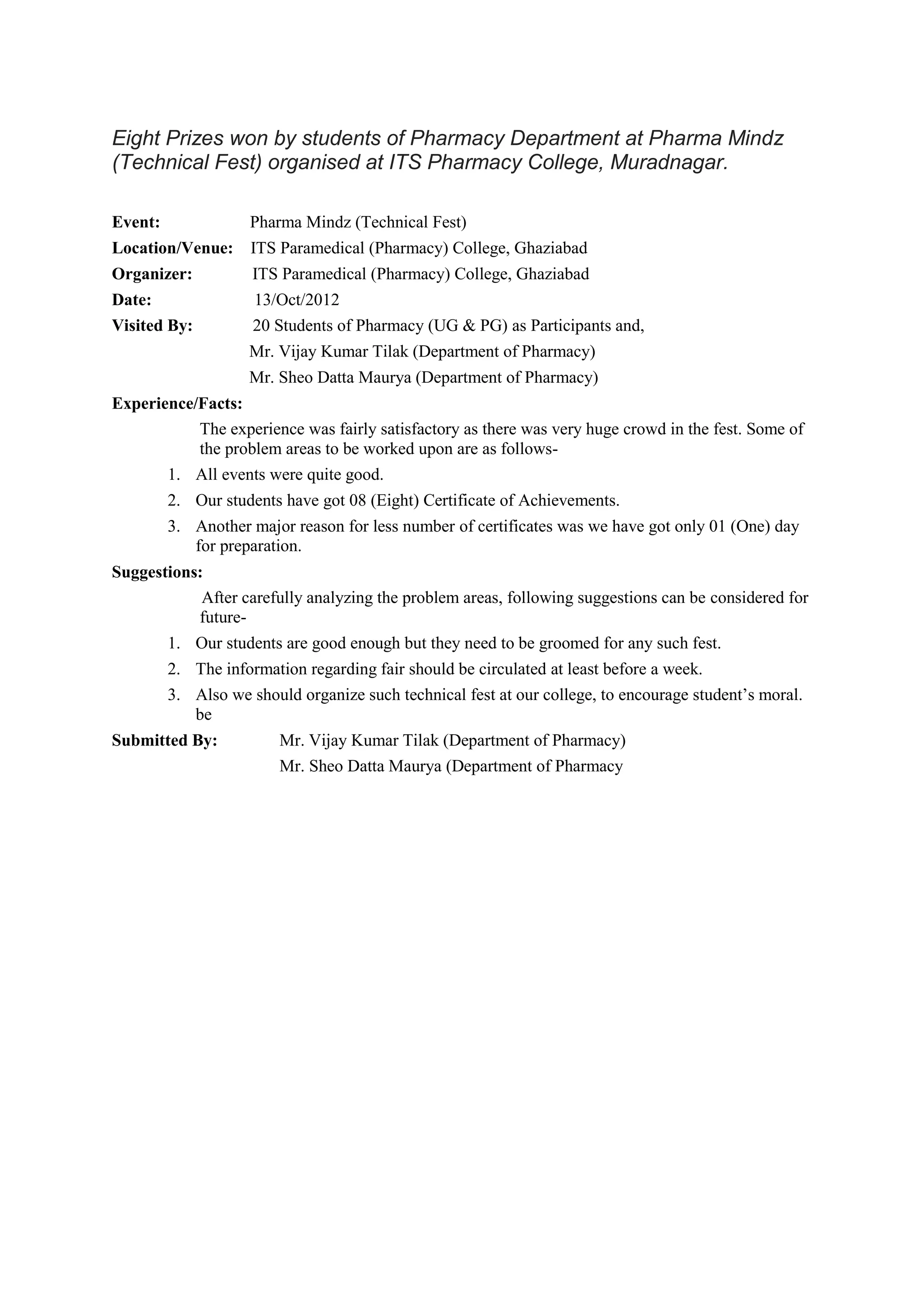 Students from the pharmacy department at ITS Paramedical College in Ghaziabad won eight prizes at the Pharma Mindz technical fest held on October 13, 2012. Despite a satisfactory experience, it was noted that limited preparation time impacted the number of achievements. Future events could benefit from earlier notification and additional grooming for participants.